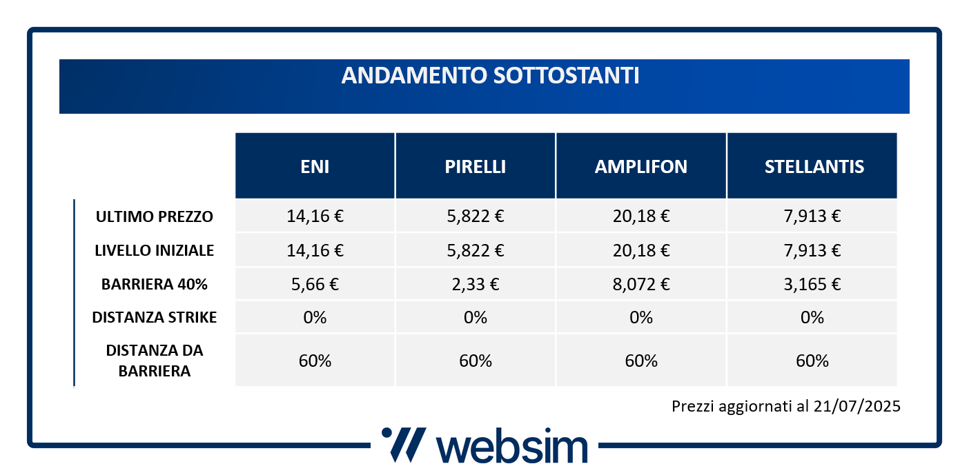 Il certificato in analisi oggi è stato emesso su Borsa Italiana il 18 luglio 2025, fissando i suoi prezzi di riferimento iniziali (Strike) alla chiusura della seduta del 18 luglio 2025. Come è facile immaginare il prodotto si distingue per il suo approccio difensivo grazie alla presenza di barriere profonde al 40%. In altre parole: anche in presenza di una correzione marcata dei sottostanti, fino al -60%, il certificato continuerà a pagare cedole e restituire il capitale a scadenza.
