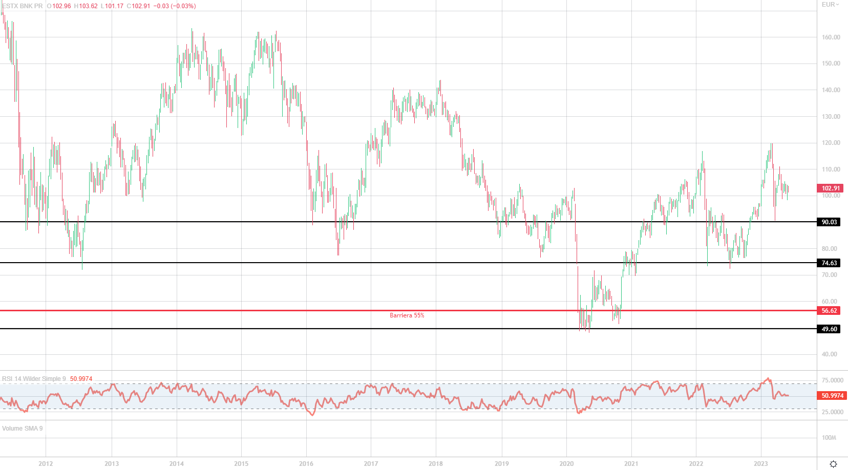 Come si vede dal grafico sotto, la barriera per l’Euro Stoxx Banks è a 56,62 punti, nei pressi dei minimi storici dell’indice bancario. Livello dunque strategico, anche perché, come ha dimostrato questa crisi bancaria che ha colpito gli USA e una banca svizzera. Le banche europee dopo anni di derisking hanno cambiato volto e si presentano ora al mercato molto più solide e patrimonializzate.