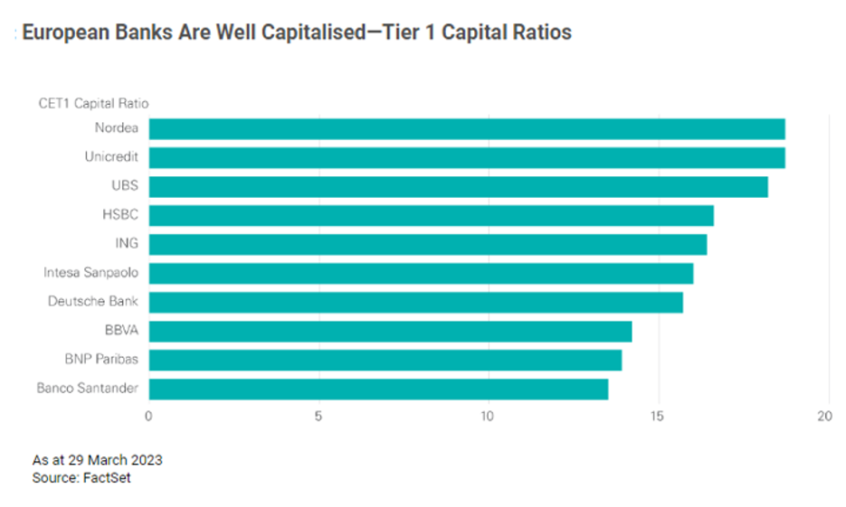 Di sicuro un elemento rassicurante per chi sceglie di investire sull’azionario europeo è dato dalla forza del suo sistema bancario, che ha retto molto bene all’urto psicologico del fallimento del Credit Suisse, poi pilotato dalle autorità svizzere ad essere inglobato dalla concorrente Ubs. Considerate le dimensioni e il ruolo internazionale del Credit Suisse, avrebbero potuto esserci anche profonde ripercussioni negative sui mercati europei.