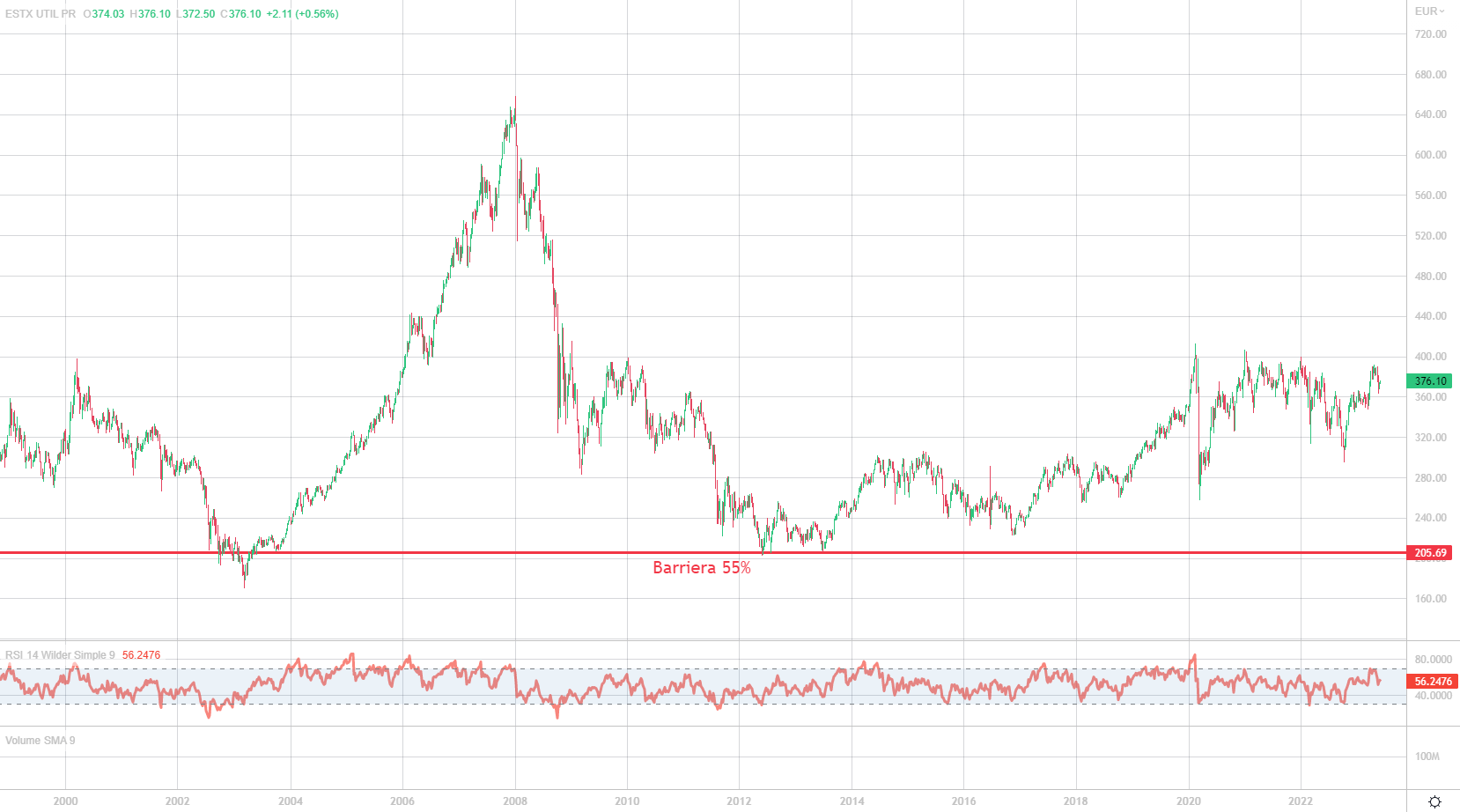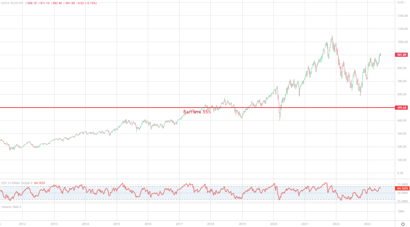 Non sarà il Nasdaq, ma anche l’indice tecnologico europeo parla chiaro. Si segnano sempre nuovi massimi. È un indice estremamente efficiente che ovviamente ha sofferto nel 2021 ma che a nostro avviso ora è tra i favoriti. La barriera si colloca a 499,68 punti, ben al di sotto dei minimi del bear market dello scorso anno che ha colpito con particolar forza proprio i settori più ciclici come la tecnologia. La posizione della barriera anche in questo caso è strategica.