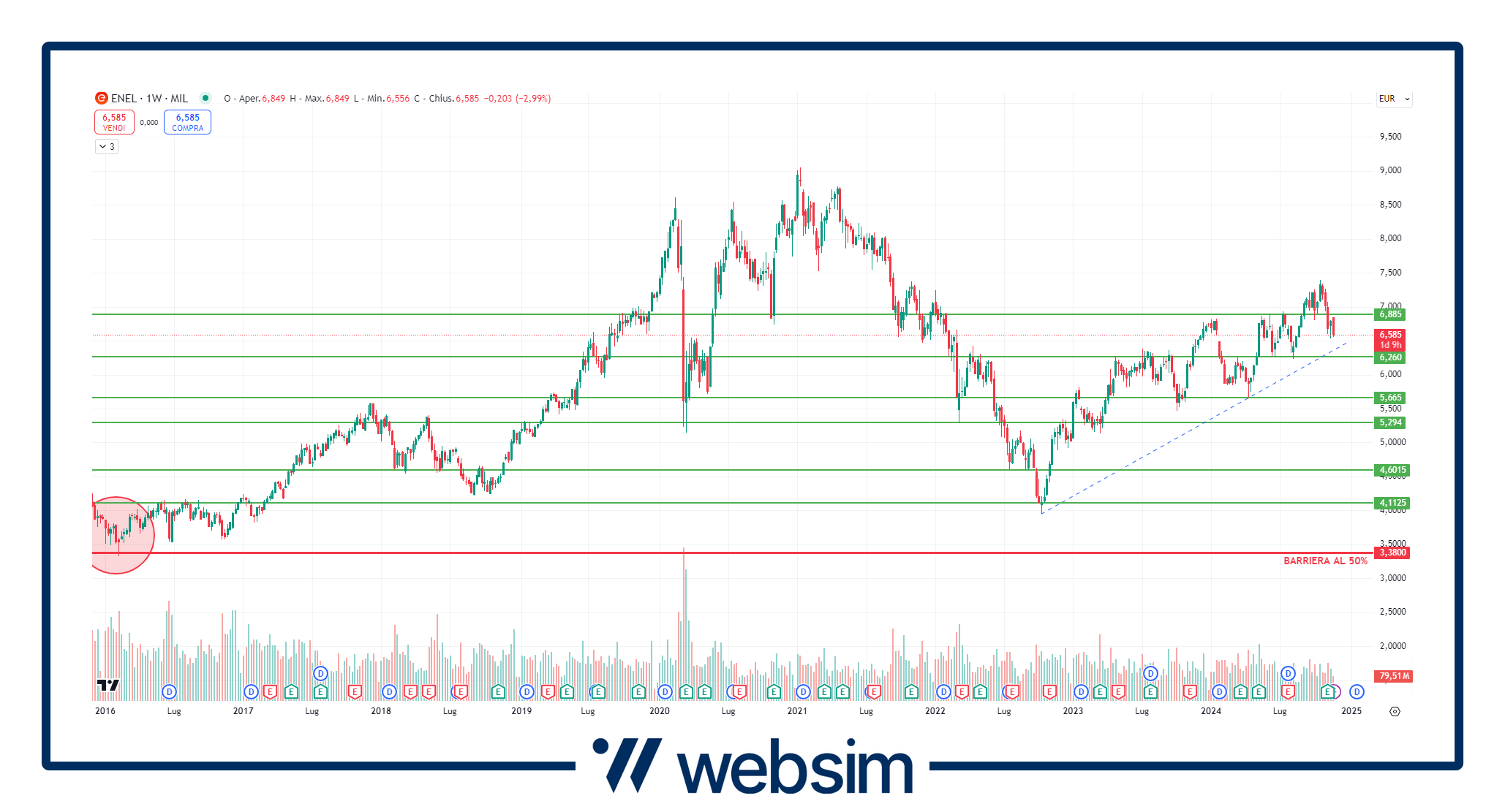 Al prezzo attuale di 6,56 euro, Enel capitalizza 66,7 miliardi di euro. Il titolo viaggia più o meno sulle stesse quotazioni dell’inizio dell’anno. Per arrivare a toccare la barriera (3,38 euro), Enel dovrebbe scendere a quotazioni che non vede da 10 anni. La quotazione attuale è sostenuta da due importanti supporti posti a 6,25 euro e a 5,50 euro.