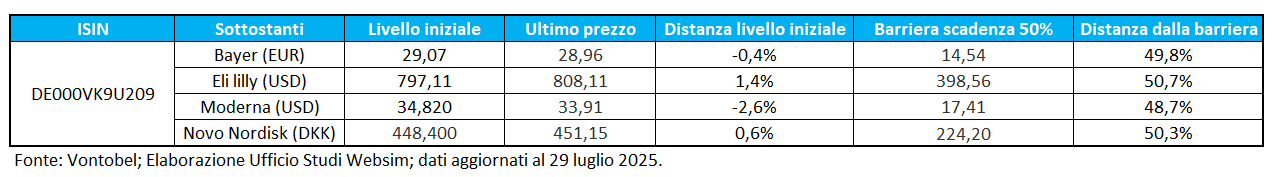 Diverse le soluzioni proposte dagli emittenti e oggi vi parliamo dell’ultimo nato in casa Vontobel. Ci riferiamo al Maxi Cash Collect ISIN DE000VK9U209 dedicato al tema d’investimento dei farmaceutici, con un basket composto da quattro colossi del segmento: Bayer, Eli Lilly, Moderna, Novo Nordisk. Il certificato paga una maxi cedola incondizionata del 20% (in realtà è prevista una soglia bonus che è del 1% degli strike, quindi il worst of dovrebbe perdere il 99% del valore da qui al 23 settembre 2025 per invalidare la maxi). Come sempre il rendimento di questi prodotti viene speso nel cedolone iniziale e poi il prodotto paga lo 0,67% bimestrale con memoria (4% annuo), condizionato ad una barriera al 50%, valida anche a scadenza. Possibilità di rimborso anticipato da maggio 2026.