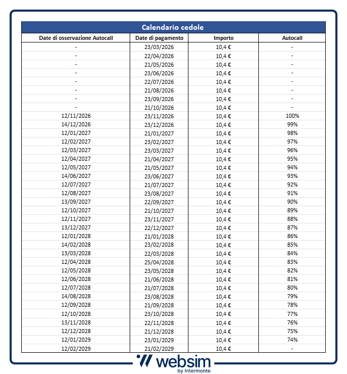 Anche questo prodotto ha scadenza naturale fissata al 21 febbraio 2029, con possibilità di rimborso anticipato grazie alla funzione di Autocall, attiva a partire da novembre 2026. La soglia parte dal 100% e scende dell'1% al mese fino al 74%. Il meccanismo è identico: se a una delle date di osservazione tutti i titoli del basket si trovano al di sopra del trigger, l'investitore ottiene il rimborso del capitale più il premio del mese corrente.