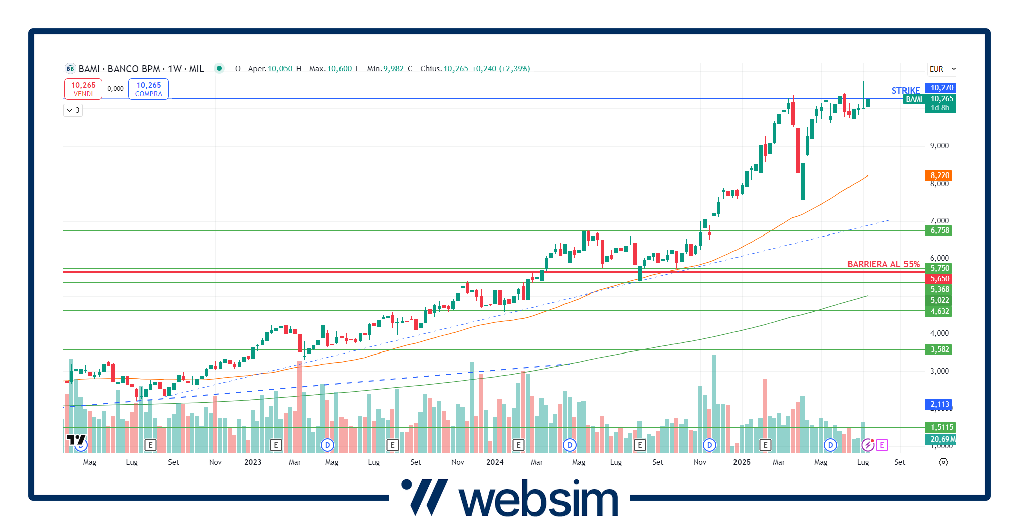 Banco BPM ha fissato il prezzo strike a quota 10,27 euro (linea blu sul grafico settimanale), sui livelli di prezzo molto vicino ai massimi del titolo da fine 2015. La barriera al 55% sul titolo si va così a posizionare a 5,65 euro (linea rossa).