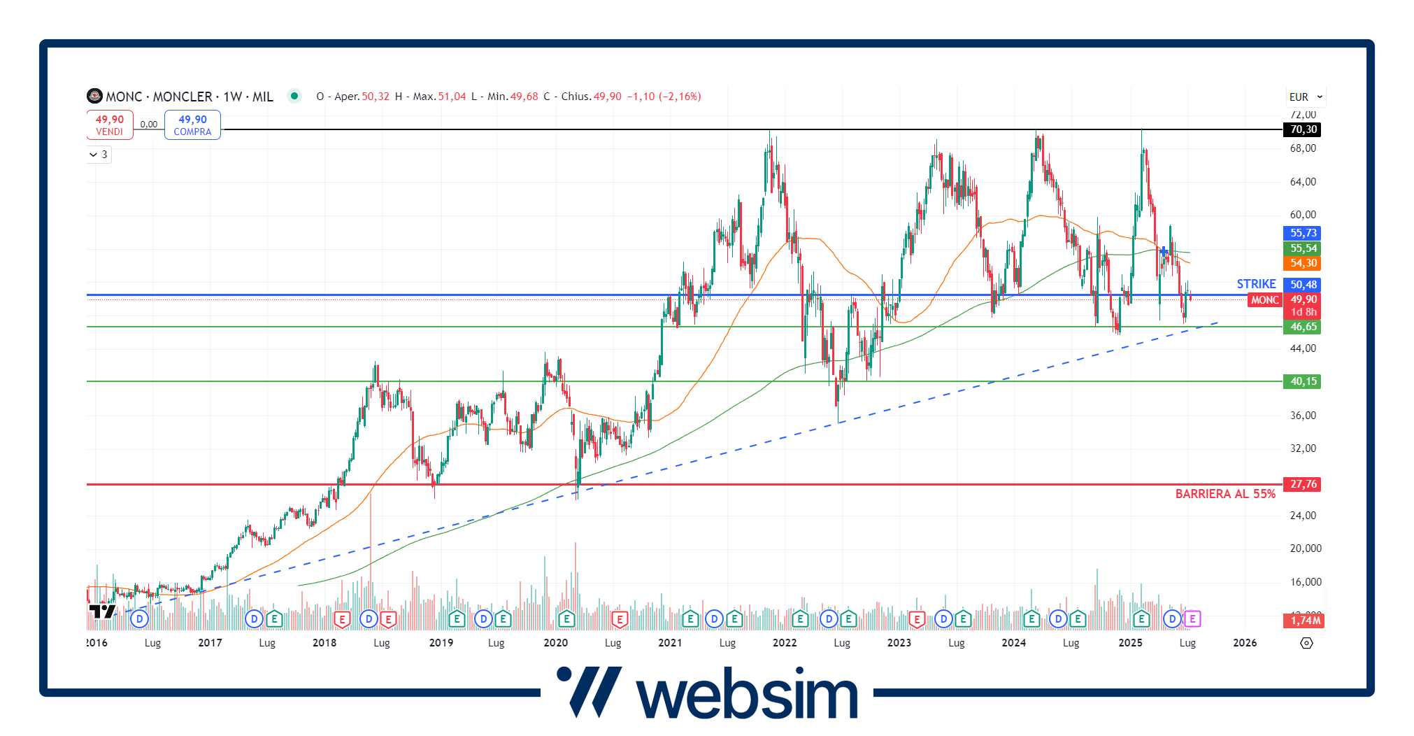 Il colosso del lusso Moncler ha come strike 50,48 euro, in prossimità di un'importante area supportiva per il titolo. La barriera al 55% si va così a posizionare a 27,7 euro, sui minimi raggiunti nel 2019 e nel 2020.