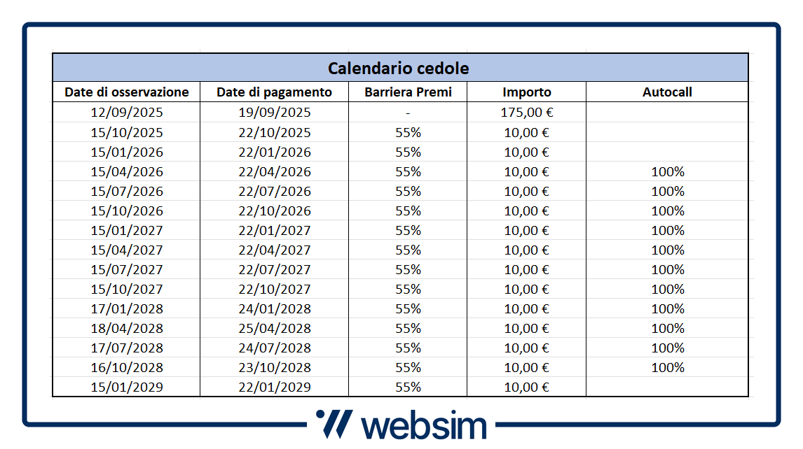 Il nuovo certificato di UBS (rating: S&P A+ / Moody's Aa2 / Fitch A+) è stato emesso sul mercato Euro TLX di Borsa Italiana il 16 luglio 2025 e che si caratterizza senza dubbio per il suo premio iniziale del 17,5%, ovvero di 175 euro a certificato visto il valore nominale di 1.000 euro. Come dicevamo tale maxi cedola iniziale non è condizionata ad alcuna barriera e sarà pertanto pagata il 19 settembre a chiunque avrà acquistato il certificato entro e non oltre la data di Cum Date del 16 settembre 2025.