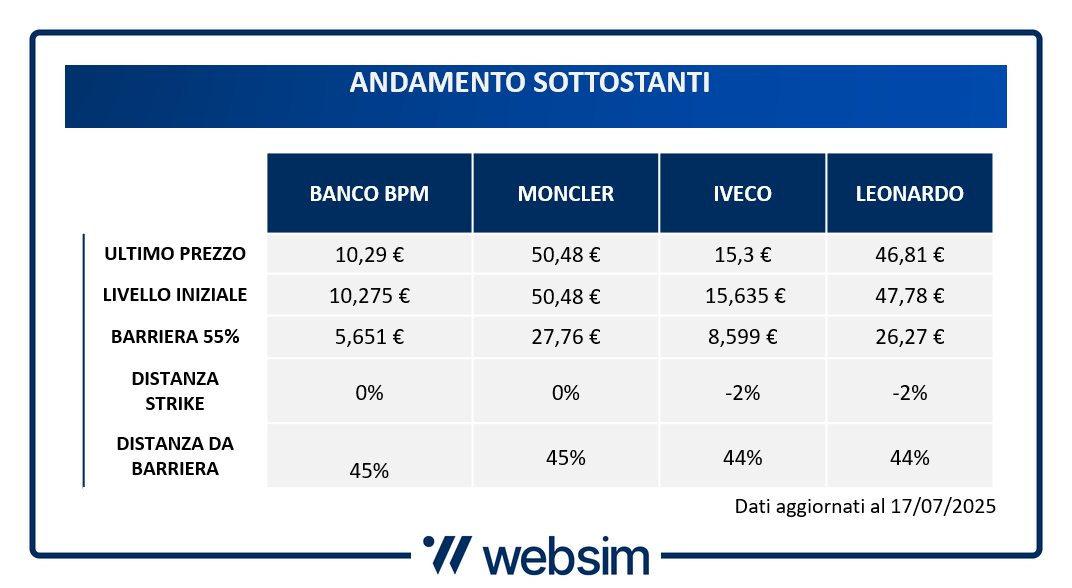 I prezzi di riferimento iniziali (Strike) sono stati fissati alla chiusura della seduta del 15 luglio. Nella tabella qui sotto possiamo vedere i prezzi iniziali e il relativo posizionamento delle barriere premi e scadenza al 55%.
