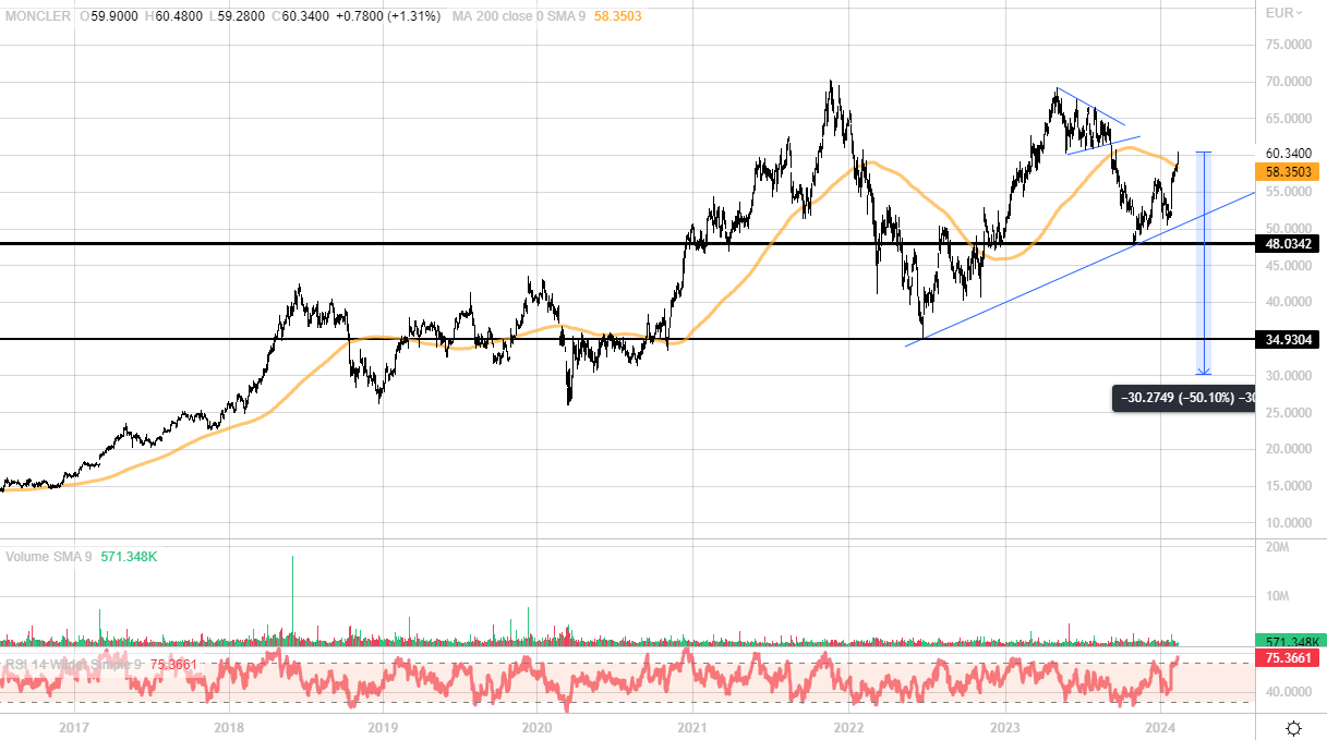Il comparto del lusso è uno dei più ambiti in borsa, con vari titoli del settore che negli ultimi anni hanno messo a segno importanti rally. Anche Moncler ha quasi raddoppiato il suo valore rispetto ai prezzi di cinque anni fa, ma il titolo non si trova sui massimi (raggiunti in area 70 euro per azione nella parte finale del 2021). Potenzialmente un elemento favorevole, anche perché il titolo ha un price/earning inferiore a 30 e scambia su multipli decisamente più bassi rispetto ad altre aziende del settore (Hermes ha un P/E di 46, mentre si sale a 66 per Salvatore Ferragamo e per Brunello Cucinelli è in area 70, giusto a titolo comparativo).