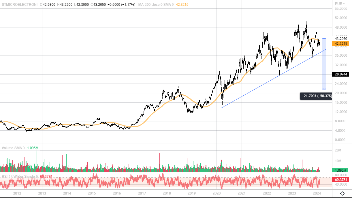 Le azioni di STMicroelectronics sono all’interno di un ampio trading range, ossia un canale laterale, che possiamo identificare circa fra i 32 ed i 47 euro per azione (escludendo un paio di spike rialzisti e ribassisti). Puntare sul titolo con un certificato di investimento potrebbe essere un interessante opzione, in grado di permettere all’investitore di estrarre rendimento anche da un’ampia fase laterale.