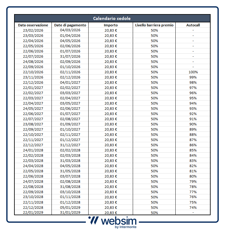 Come per il primo certificato, tutti i premi godono dell'effetto memoria e il meccanismo di Autocall è attivo da ottobre 2026 con trigger decrescente dall'1% mensile, partendo dal 100% fino al 74%.
