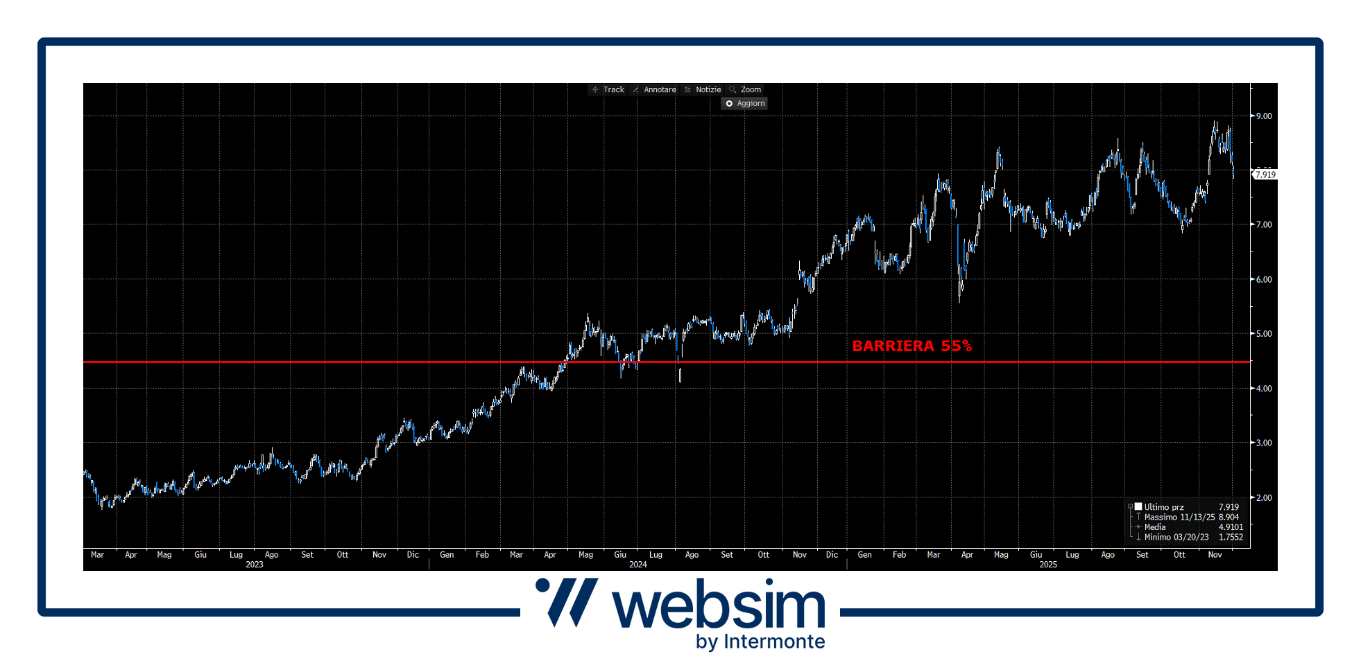 Per concludere, dopo anni in cui l'intero settore ha beneficiato della crescita degli utili trainata dai margini di interesse elevati, il 2026 si presenta come una fase di consolidamento in cui sarà necessaria una maggiore selettività nella scelta dei titoli bancari. In questo contesto, Banca Monte dei Paschi di Siena emerge come uno dei nomi su cui gli analisti mantengono una view positiva, distinguendosi per solidità patrimoniale e prospettive di crescita. E la struttura del certificato permette di ammortizzare eventuali fasi di volatilità anche importante che il comparto potrebbe incontrare, grazie alla presenza di barriere di protezione al 55% (proteggono dunque fino a cali del 45% del titolo dai livelli attuali).