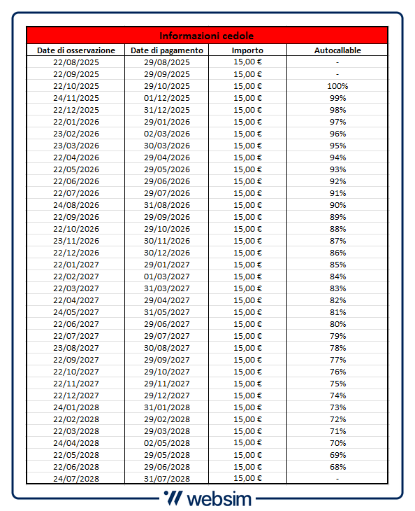 A scadenza, 31 luglio 2028, gli scenari sono solo due: se tutti i titoli saranno sopra la barriera al 55% degli strike, il certificato rimborserà 1.000 euro, più l’ultima cedola, più le cedole eventualmente non pagate. Se anche solo un titolo sarà sotto barriera, il certificato rimborserà la performance del peggiore.