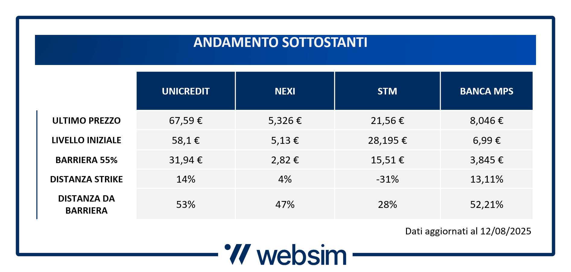 Per chi è a caccia di certificati ad alto rendimento, Societe Generale mette sul piatto un Fast Cash Collect ad altissimo rendimento dedicato al mercato italiano. Ci riferiamo al nuovo ISIN XS2878504419 costruito su un basket worst of composto da quattro blue chip italiane: STM, Nexi, Banca MPS e UniCredit. Il certificato paga infatti un premio mensile del 1,5% con memoria (18% annuo), condizionato ad una barriera al 55% degli strike (fissati il 22 luglio).