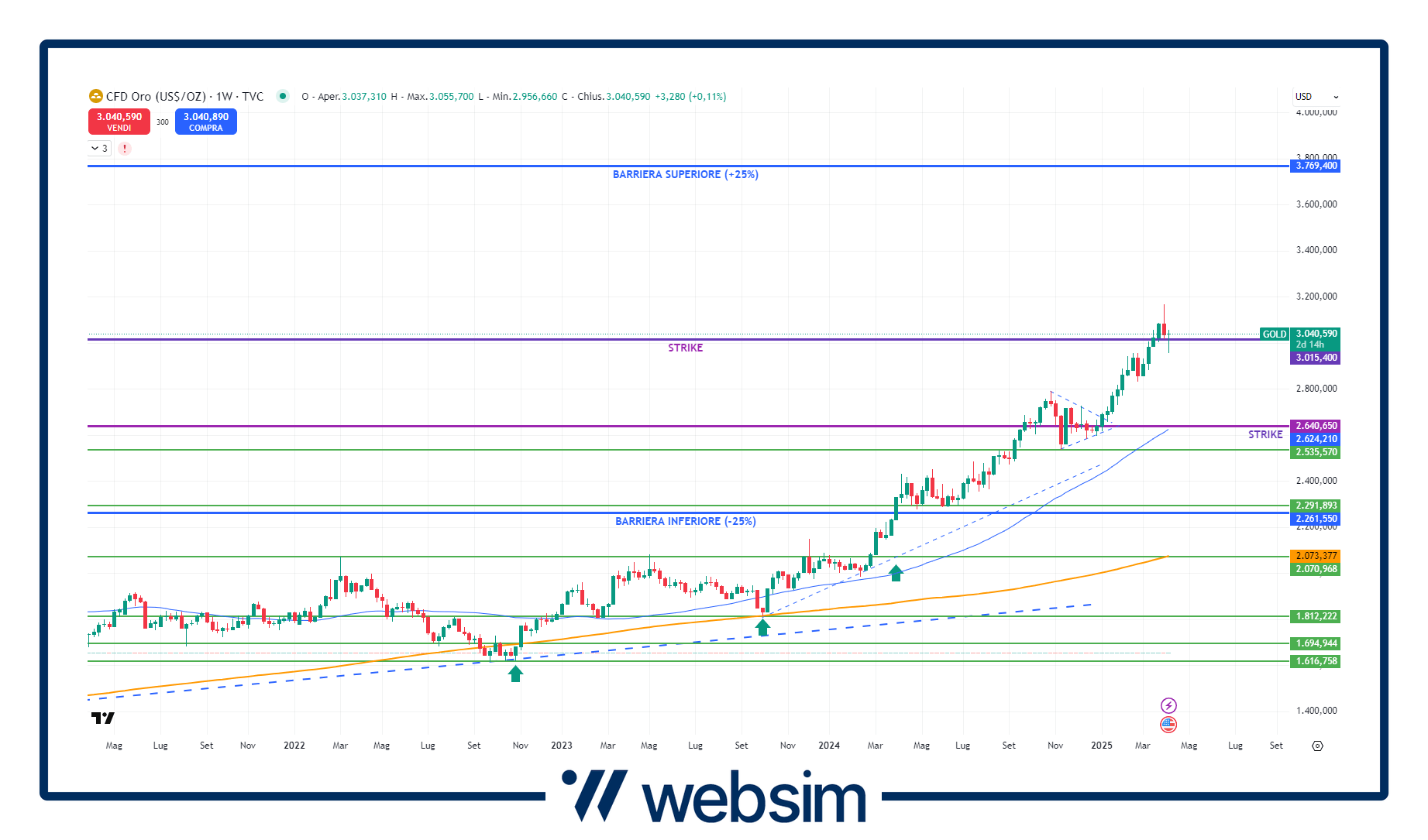 Lo strike (valore iniziale) è il prezzo segnato dall’oro l’8 aprile 2025, vale a dire 3.015,4 dollari all’oncia. Di conseguenza, il limite (barriera) all’insù per avere il rendimento massimo è 3.769,25 dollari (+25%), mentre il limite all’ingiù è 2.261,55 dollari (-25%).