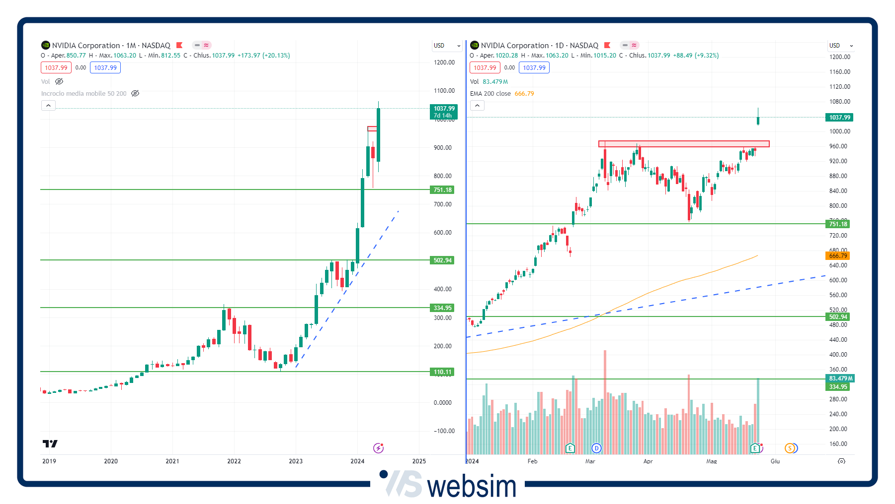 La presentazione dei risultati ha innescato una nuova raffica di acquisti sul titolo che in borsa nella seduta di ieri è balzato di oltre il 9% approdando così per la prima volta nella sua storia sopra la soglia dei 1.000 dollari ad azione. La cavalcata del gigante dei chip è ben visibile dai grafici rappresentati qui sotto, dove troviamo a sinistra il suo andamento di lungo periodo e quindi su time frame mensile, mentre a destra lo possiamo apprezzare su scala giornaliera. Ecco che come vediamo, dopo i conti il titolo ha messo a segno un deciso breakout rialzista dell'importante resistenza statica (ora principale zona supportiva) in area 960 dollari, giungendo così fino a testare il suo massimo intraday (e nuovo record storico) a 1.063 $.