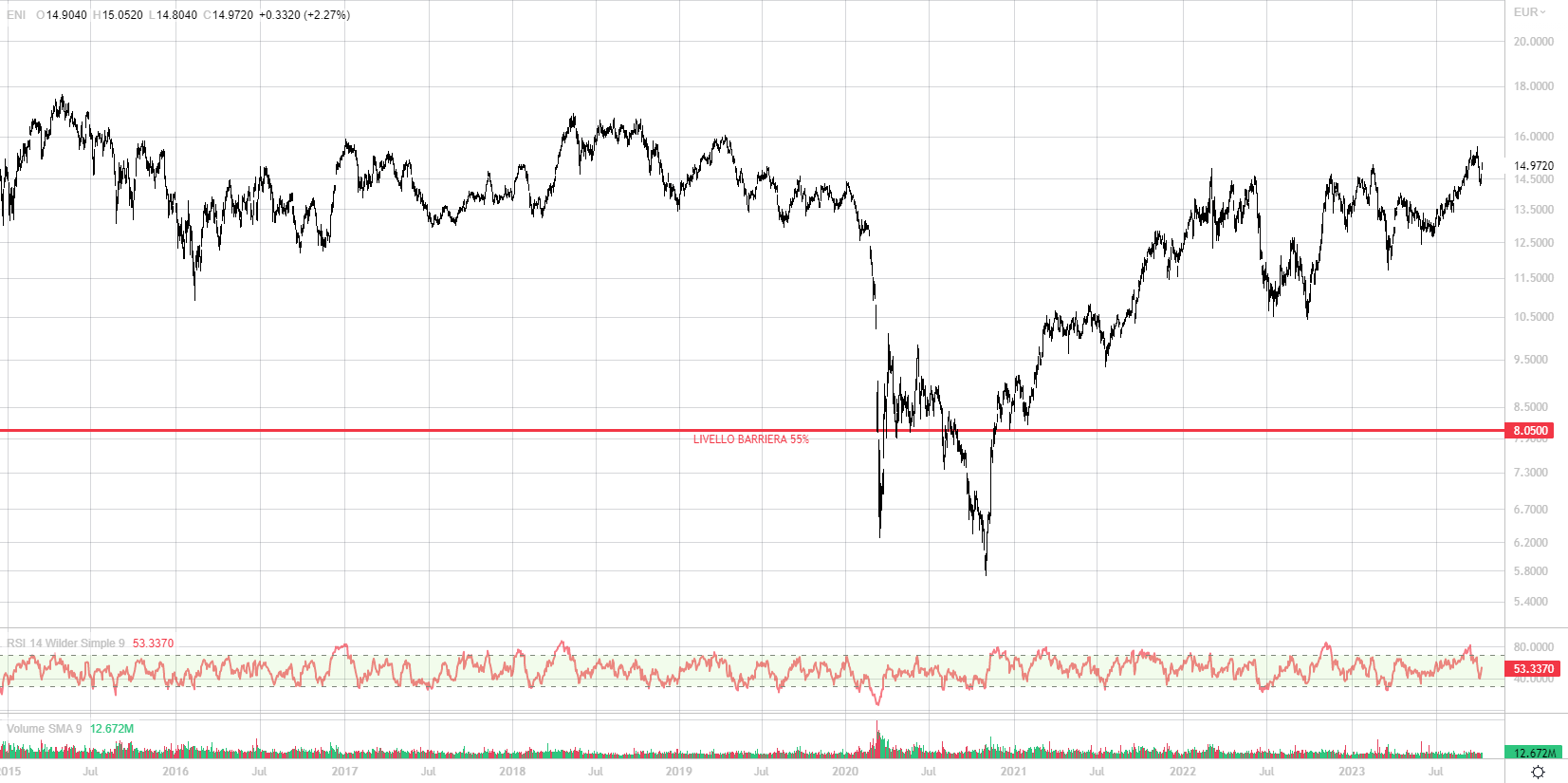 Le azioni di Eni, dopo il crollo del 2020, spiegabile quasi unicamente con lo scoppio della pandemia del Covid e con i conseguenti lockdown globali, hanno progressivamente ripreso vigore. Il titolo è inserito in un trend positivo, aggiornando i massimi da oltre tre anni nel mese di settembre, in area 15,5 euro. Di fatto le azioni di Eni hanno recuperato i valori precedenti il Covid. La discesa degli ultimi giorni sotto quota 15 euro appare fisiologica (e di fatto abbassa i prezzi di strike iniziale). Il titolo ha una capitalizzazione di mercato che sfiora i 50 miliardi. La barriera posta a 8,05 euro appare ben ragionata poiché si avvicina molto ai minimi covid, livelli frutto però di un cigno nero difficilmente ripetibile nei prossimi anni.