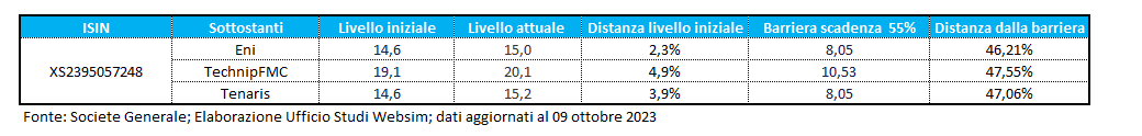 Cedole trimestrali con memoria del 2,75% (rendimento annuo del 11%) e barriere al 55%. Il nuovo certificato di Société Generale ISIN XS2395057248 sui petroliferi: Eni, Tenaris e TechnipFMC.