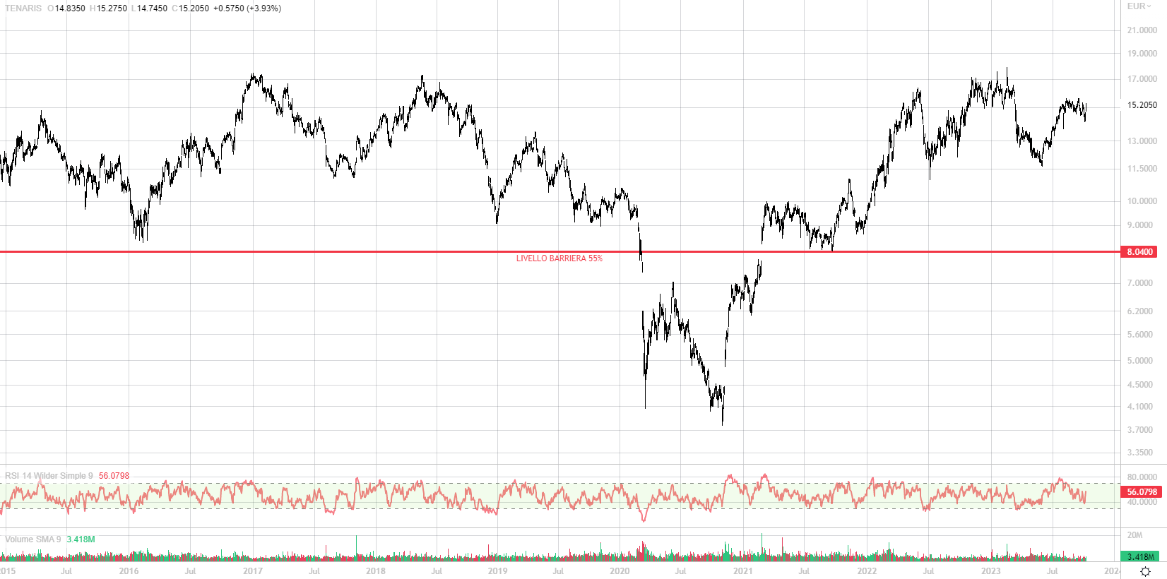 Anche l’operatività di Tenaris, secondo sottostante del certificato, è strettamente legata al comparto petrolifero. L’azienda, infatti, è la prima al mondo nella produzione e fornitura di tubi e servizi per l’esplorazione volta alla produzione di petrolio e gas. Anche Tenaris dopo il blackout patito durante il Covid ha messo a segno un rally notevole, arrivando addirittura oltre quota 17 euro per azione. I primi mesi del 2023 sono stati sotto le attese, con un calo verso i 12 euro, cui ha fatto seguito una nuova ripresa verso i 14,5. L’azione, parte del paniere centrale del FTSE Mib, capitalizza oltre 17 miliardi di euro. Anche in questo caso la barriera si colloca su un livello di supporto chiave a 8,04 euro, che separa il periodo covid dal pre e post covid. Appare quindi un livello strategico e di fatti se guardiamo il grafico dal 2005, solo due volte Tenaris è andato sotto questo livello per poi recuperarlo: nel 2009 e con il covid.