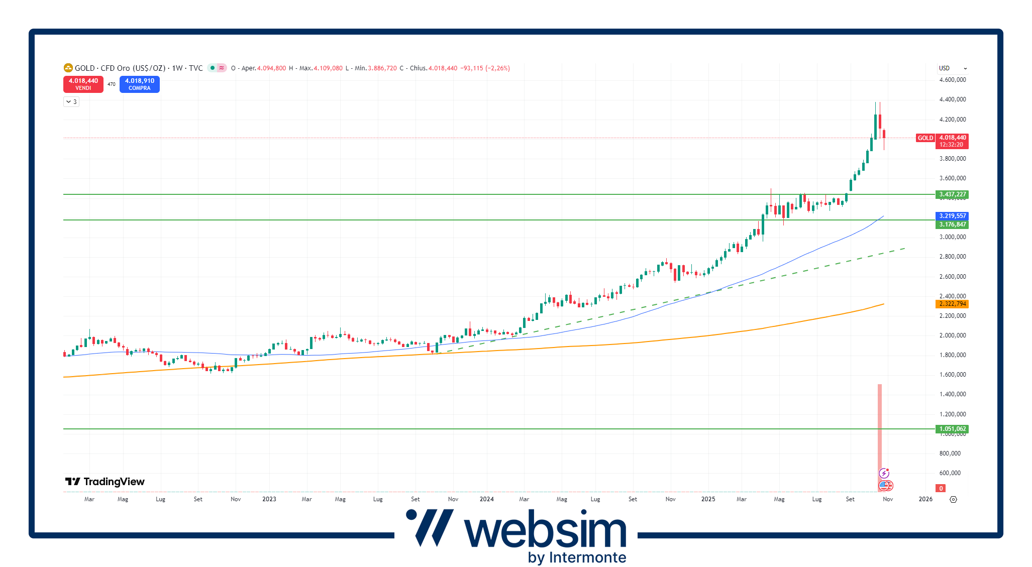 Sul piano tecnico, la fase correttiva ha riportato i prezzi dell'oro a testare il supporto dinamico a 4.080 $/oz e la trendline rialzista avviata ad agosto e ancor prima da ottobre 2023. Restano cruciali il livello psicologico dei 4.000 $/oz e il supporto statico a 3.950 $/oz: una chiusura settimanale al di sotto di tali soglie aprirebbe spazio a ulteriori ribassi verso il supporto statico a 3.440 $/oz.