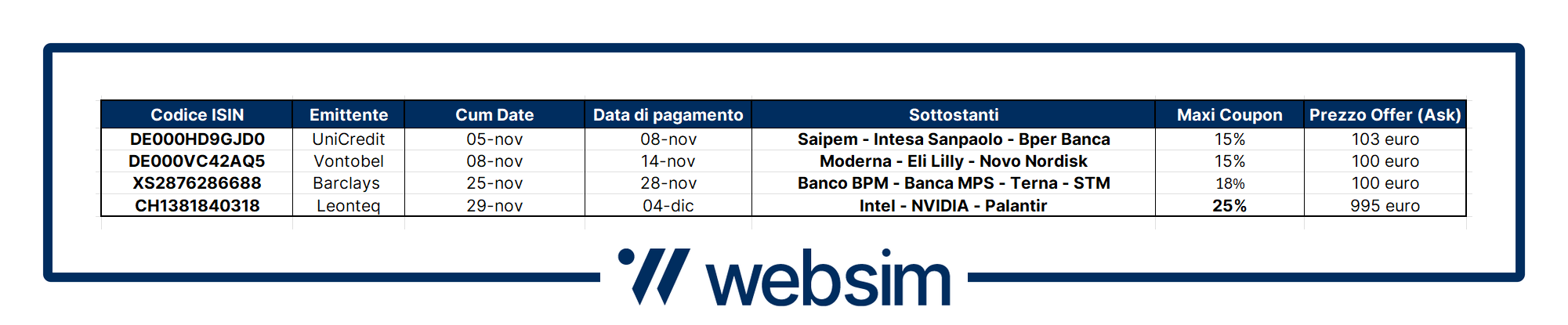 Ricordiamo, prima dell’adesione, di leggere attentamente il prospetto di base, ogni eventuale supplemento, la nota di sintesi, le condizioni definitive e il documento contenente le informazioni chiave (KID) e, in particolare, le sezioni dedicate ai fattori di rischio connessi all’investimento, ai costi e al trattamento fiscale relativi ai prodotti finanziari ivi menzionati reperibili sul sito dell’emittente.