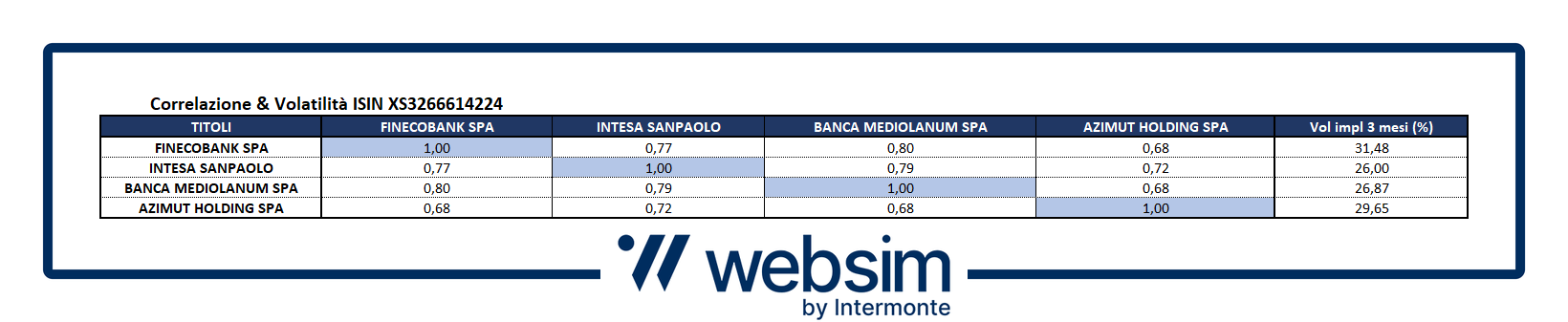 Per un certificato con struttura Worst Of, una correlazione elevata è generalmente positiva: riduce il rischio di divergenze marcate tra i sottostanti e limita la probabilità che un singolo titolo si discosti significativamente dagli altri, favorendo una dinamica più omogenea del basket. In termini di volatilità implicita a 3 mesi, FinecoBank (31,48%) è la più volatile, mentre Intesa Sanpaolo (26,00%) si conferma la più difensiva.