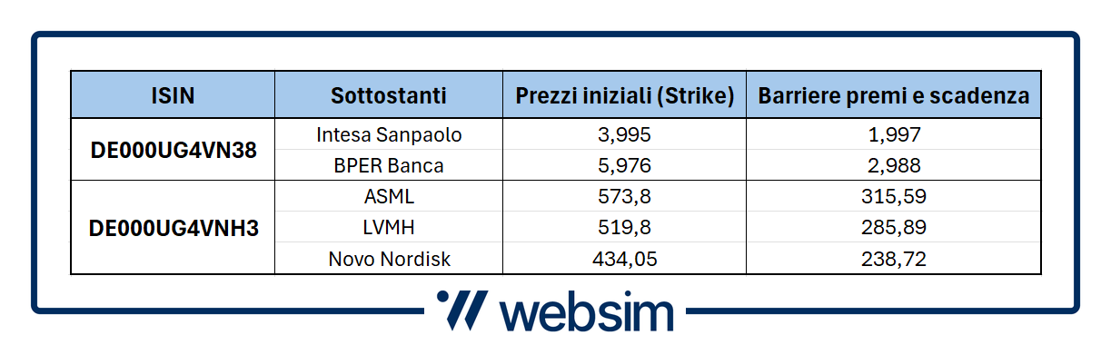 Il primo, identificato dal codice ISIN DE000UG4VN38, punta sul comparto bancario italiano e in particolare sulla coppia Intesa Sanpaolo e BPER Banca. Per quanto riguarda la struttura, prevede fino a scadenza, ovvero tra tre anni, cedole mensili con memoria dello 0,94% (11,28% annuo) condizionate ad una barriera al 50% e dunque su livelli molto profondi visto lo strike azzeccato dopo la brusca correzione vista da inizio aprile.