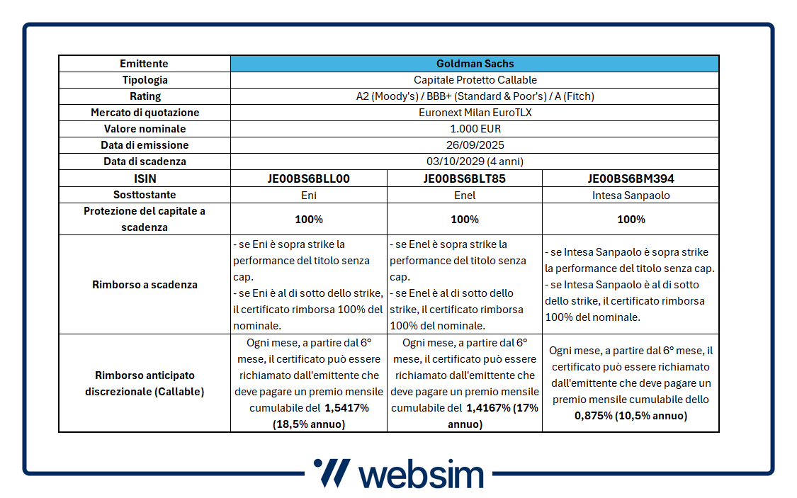 Da Goldman Sachs, tre Capitale Protetto al 100% Callable su Eni, Enel e Intesa Sanpaolo. A scadenza performance senza cap e se l’emittente richiama paga premi generosi