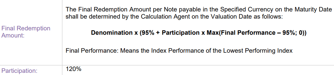 Dove la Denomination è il valore nominale di 1.000 euro, la Participation è 120% (quindi la leva) e la Final performance è la performance del worst of a scadenza. Nell’esempio che abbiamo ipotizzato +10%. Quindi: 1.000 X (95% + 120% X (110%-95%) = 1.130 euro. Pari ad una performance del 13% sul nominale e non del 12% come sarebbe se lo strike fosse al 100% del valore iniziale.