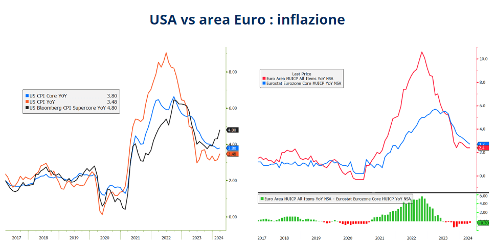 La cosa interessante è che negli ultimi 30 giorni abbiamo avuto due divergenze più evidenti. Quella tra gli indicatori sulla crescita e l’inflazione USA: al di sopra delle attese quella su inflazione e sotto attese quella sulla crescita. La seconda (vedi grafico), quella tra i prezzi al consumo in Europa e USA. In USA, soprattutto il supercore (al netto di alimentari, energia e spese per abitazioni) è salito, mentre in Europa l’inflazione è scesa.