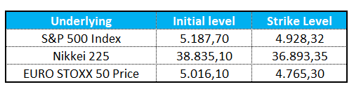 Protezione al 95%, leva 1,2X e partecipazione senza cap. Tutto nel nuovo certificato a capitale protetto di Natixis ISIN IT0006762915 su tre indici: S&P 500, Nikkei 225 e EURO Stoxx 50.