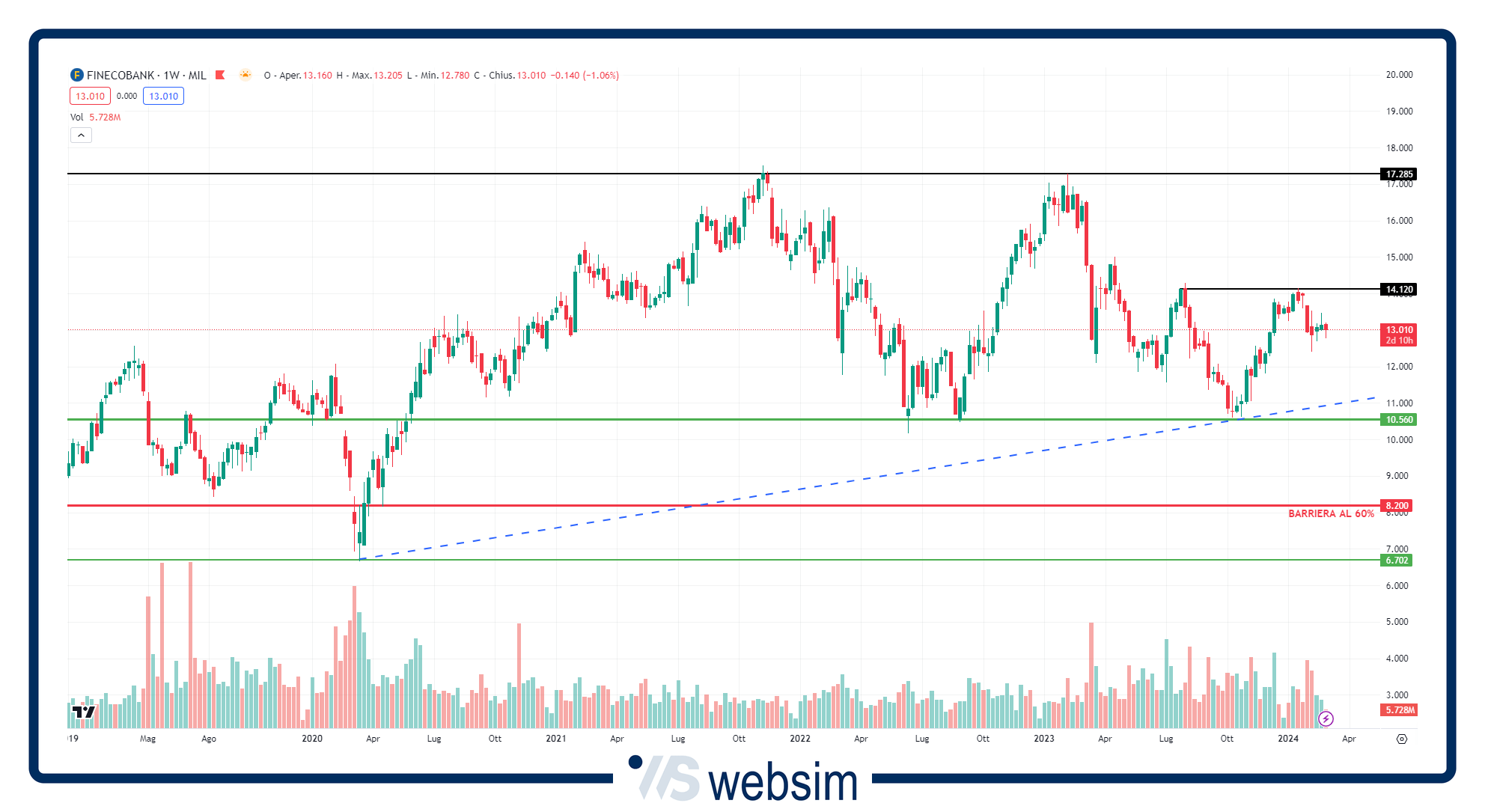 Il certificate CH1316653794 fissa la barriera per le azioni Fineco a 8,196 euro: bisogna dire che le quotazioni di Fineco non scendono sotto quel livello dal marzo 2020, durante il minimo della crisi del Covid.