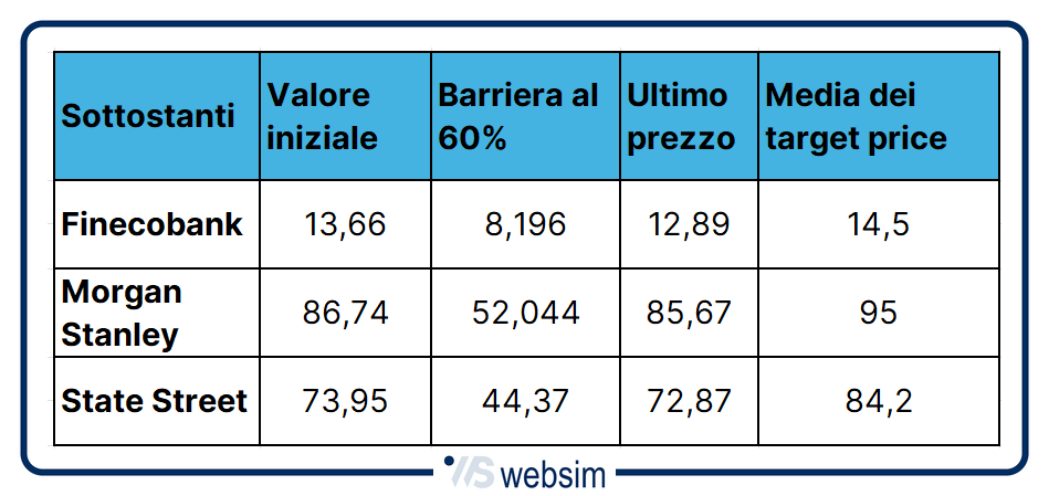 Alla scadenza (gennaio 2027), se le azioni di Fineco, Morgan Stanley e State Street saranno sopra il Valore iniziale, il certificate verrà rimborsato al valore iniziale di 1.000 euro e l’investitore riceverà l’ultimo premio e i premi eventualmente non pagati e trattenuti in memoria.