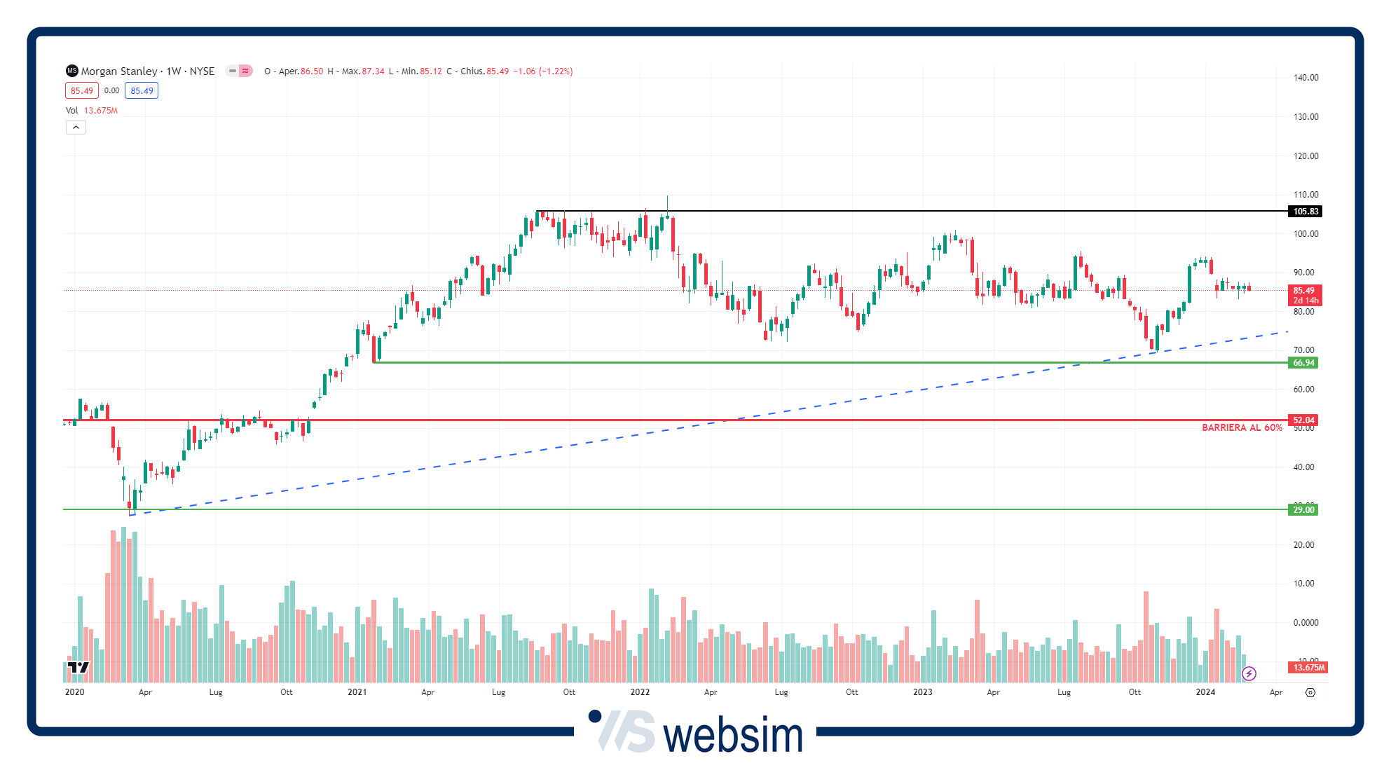 Anche l’azione Morgan Stanley è reduce da un 2023 difficile: negli ultimi 12 mesi il titolo è sceso dell’11%. La media dei target price degli analisti è 95 dollari, un prezzo più alto del 10% rispetto alla quotazione attuale.