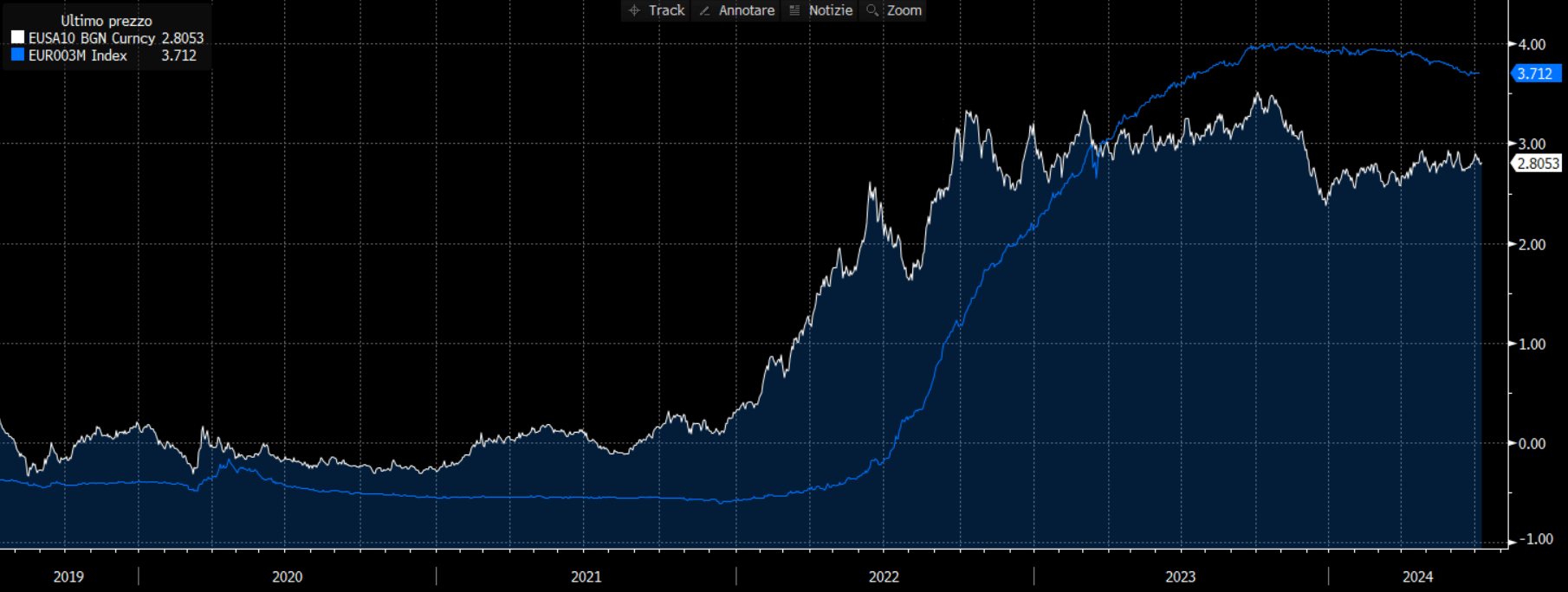 Senza entrare troppo nei dettagli tecnici, è chiaro però che questo indice è fortemente influenzato dalle politiche delle banche centrali e quindi dai movimenti del tasso sui depositi della BCE. In questo senso, dunque, c’è una certa correlazione tra le decisioni delle politiche monetarie delle banche centrali, la dinamica del tasso sui depositi BCE ed il tasso CMS. Lo si vede bene dal grafico sotto dove abbiamo inserito in un periodo di 5 anni l’andamento (in bianco) del CMS 10y e dell’Euribor 3M (in blu). La scelta di confrontarlo all’Euribor 3M, sta proprio nel fatto che questo è uno dei tassi di mercato che meglio approssima e segue i movimenti del tasso sui depositi della BCE. Si vede bene che la correlazione tra i due indici negli ultimi cinque anni è stata molto buona.