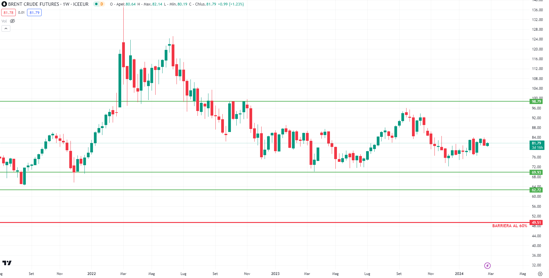 Come dicevamo, anche in questo caso la barriera di protezione si trova ampiamente sotto questi livelli (collocata poco sotto i 50 dollari al barile a 49,5 dollari, linea rossa nel grafico sotto), prezzo che negli ultimi cinque anni si sono visti soltanto durante il Covid.