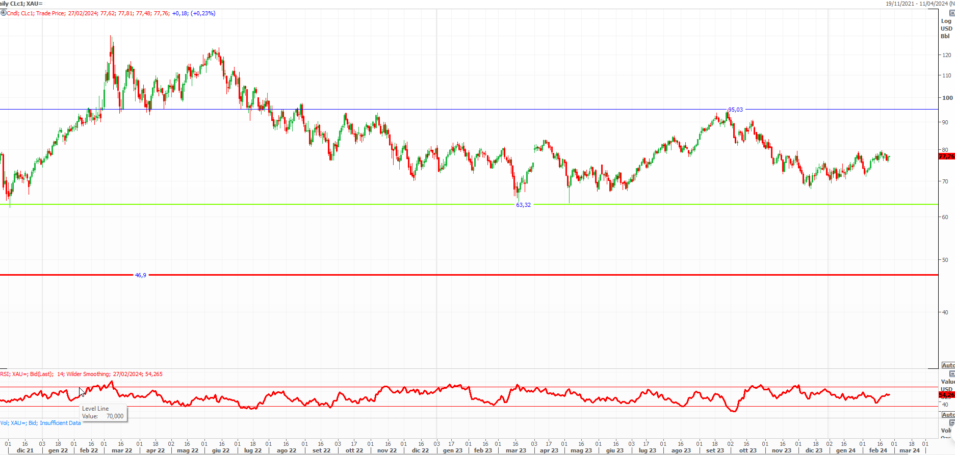 Come da tradizione il Brent, petrolio del Mare del Nord Europa, naviga su valori leggermente più alti rispetto al WTI, acronimo di West Texas Intermediate e benchmark per il greggio americano. Operativamente, infatti, il prezzo del Brent quota sopra gli 80 dollari, mentre il WTI vale attualmente circa 78 dollari al barile. Partiamo con l’analisi del WTI.