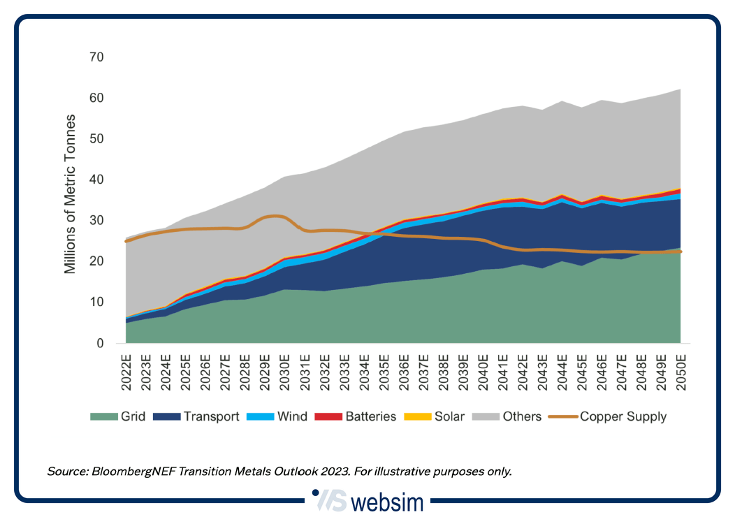 Le prospettive divergenti nei prossimi decenni tra la domanda e l'offerta di rame sono ben osservabili dal grafico qui sotto di Bloomberg. Come vediamo, se la domanda di rame è vista in continua crescita, l'offerta è vista sostanzialmente stabile fino al 2030, per poi iniziare a decrescere.