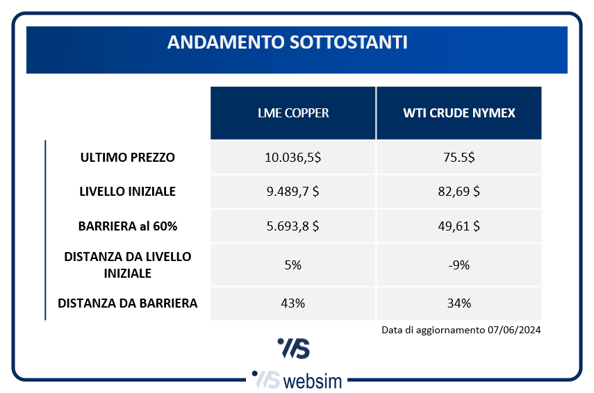 Nel dettaglio, il certificato ISIN CH1336238634 punta sul basket worst of composto dal rame (prendendo come sottostante il prezzo spot LME Copper 3M, ticker Bloomberg LMCADY Comdty), e il future del petrolio americano (contratto generico WTI, con ticker Bloomberg CL1 Comdty).