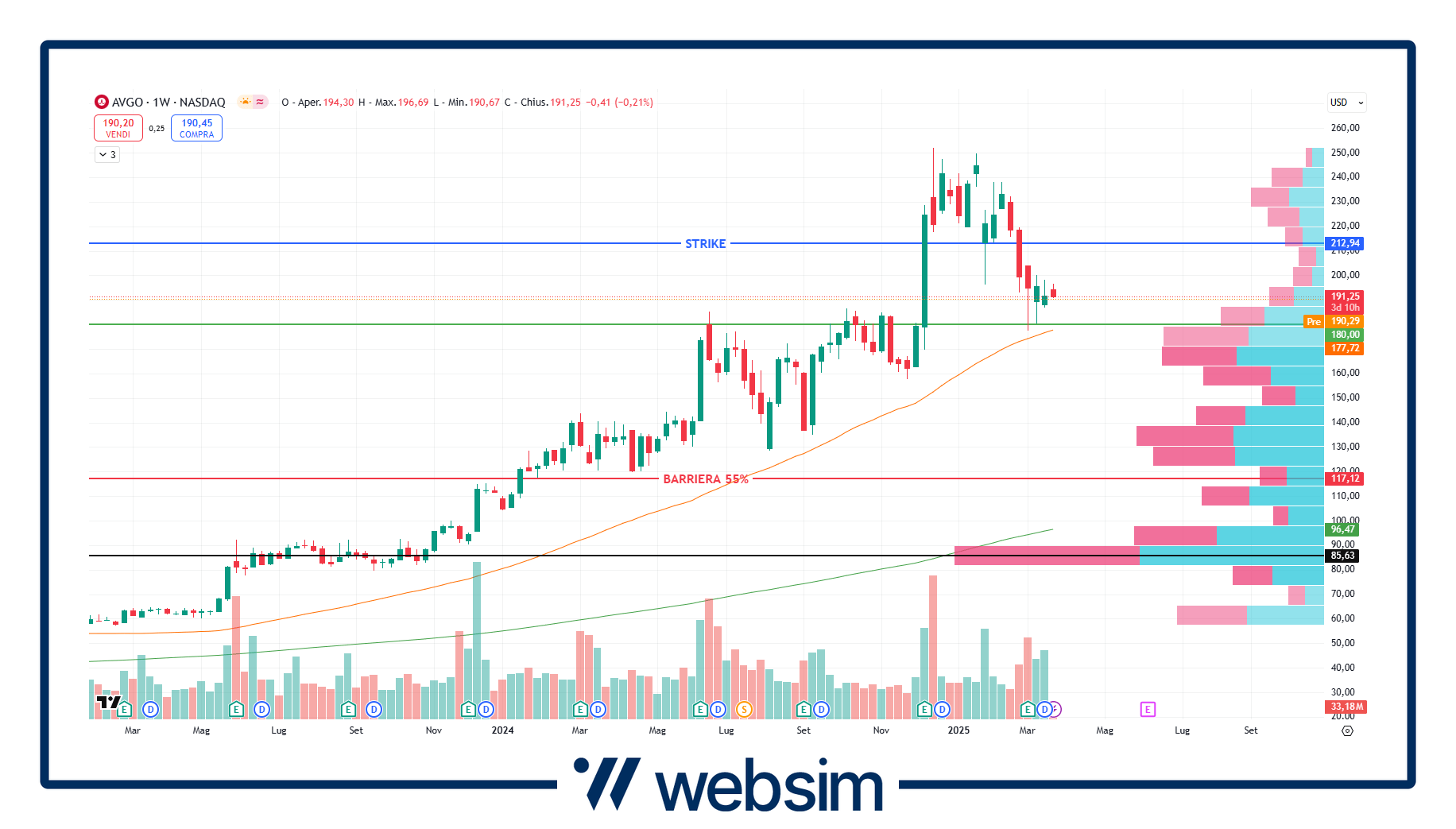 Broadcom ha fissato il suo prezzo iniziale (strike= linea blu sul grafico settimanale) a 212,94 dollari, con la barriera al 55% (linea rossa) che si trova così a quota 117,11 dollari.