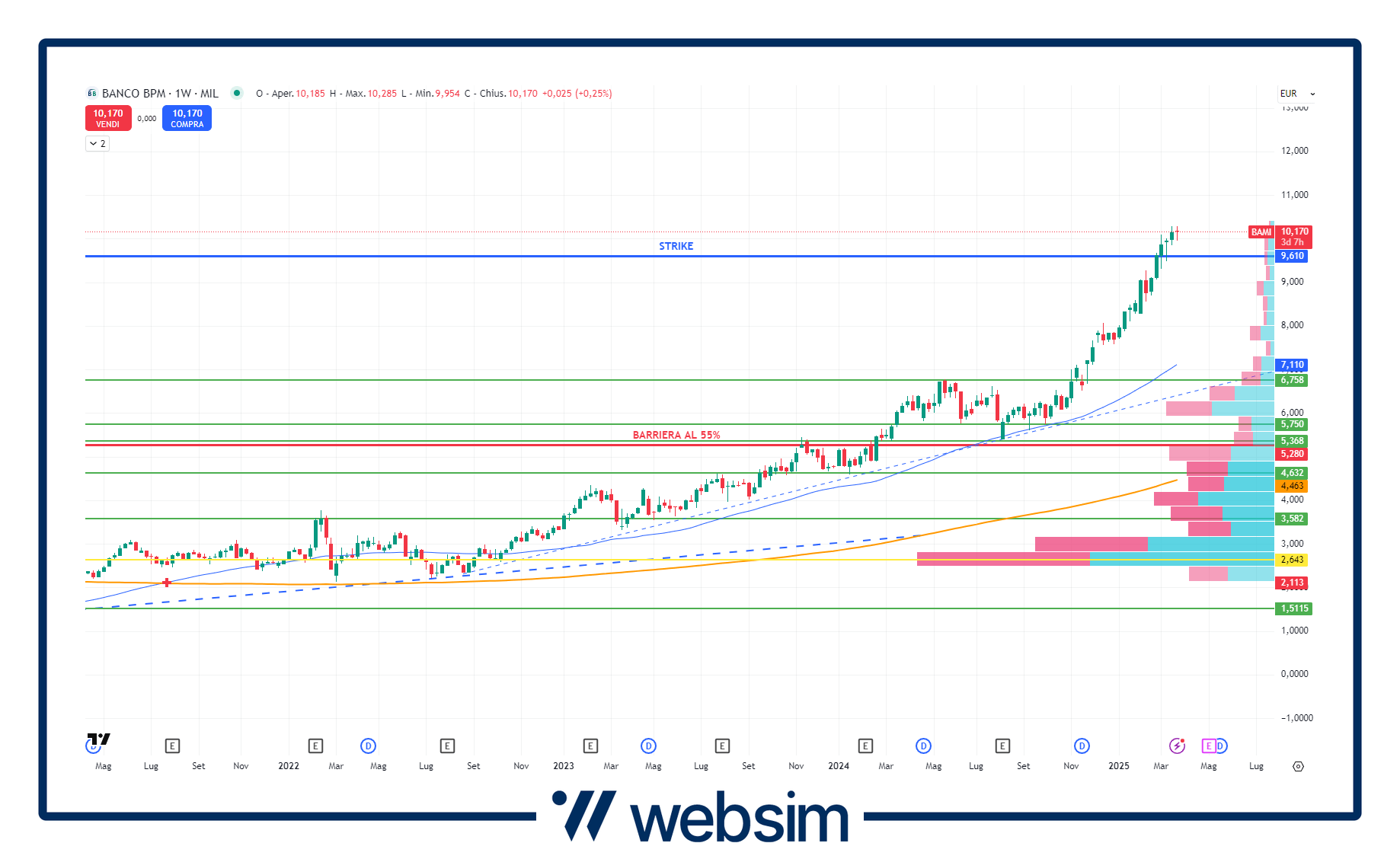 Banco BPM ha fissato il suo prezzo strike a 9,61 euro (linea blu), con la barriera al 55% che si trova così a 5,28 euro, prezzi che il titolo non rivede da febbraio 2024. Il grafico è su base settimanale (andamento da metà 2022 ad oggi).