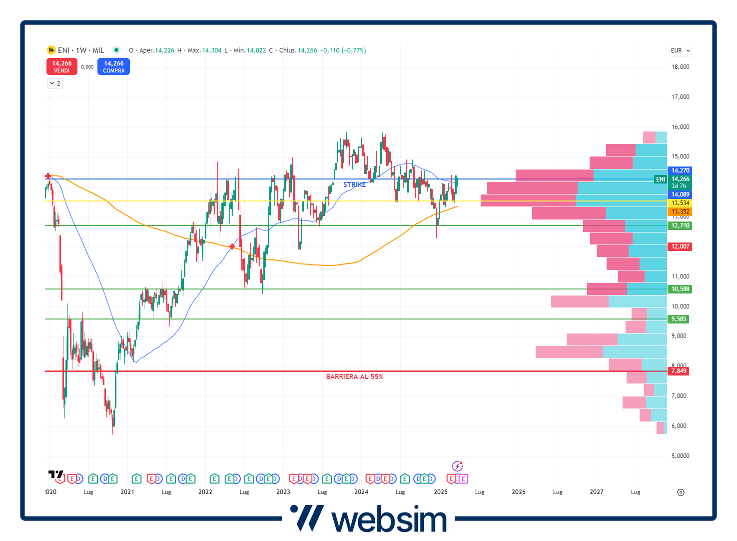 Nel grafico possiamo vedere l'andamento di Eni su time frame settimanale (da fine 2020 ad oggi). La linea blu indica il prezzo strike, mentre quella rossa il posizionamento della barriera al 55% osservata per le cedole e a scadenza. Livelli di supporto: 12,7 eu; 10,58 eu; 9,58 eu.
