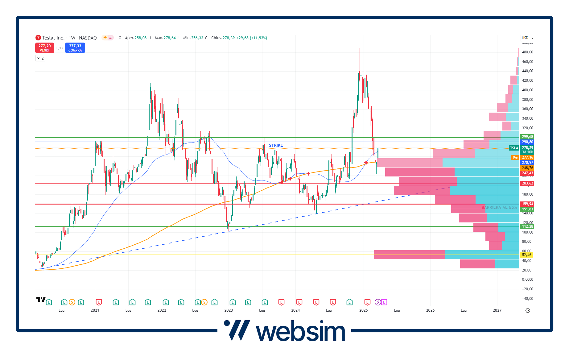 Tesla ha fissato il suo prezzo iniziale (strike= linea blu sul grafico settimanale) a 290,8 dollari, con la barriera al 55% (linea rossa) che si trova a quota 159,94 dollari.
