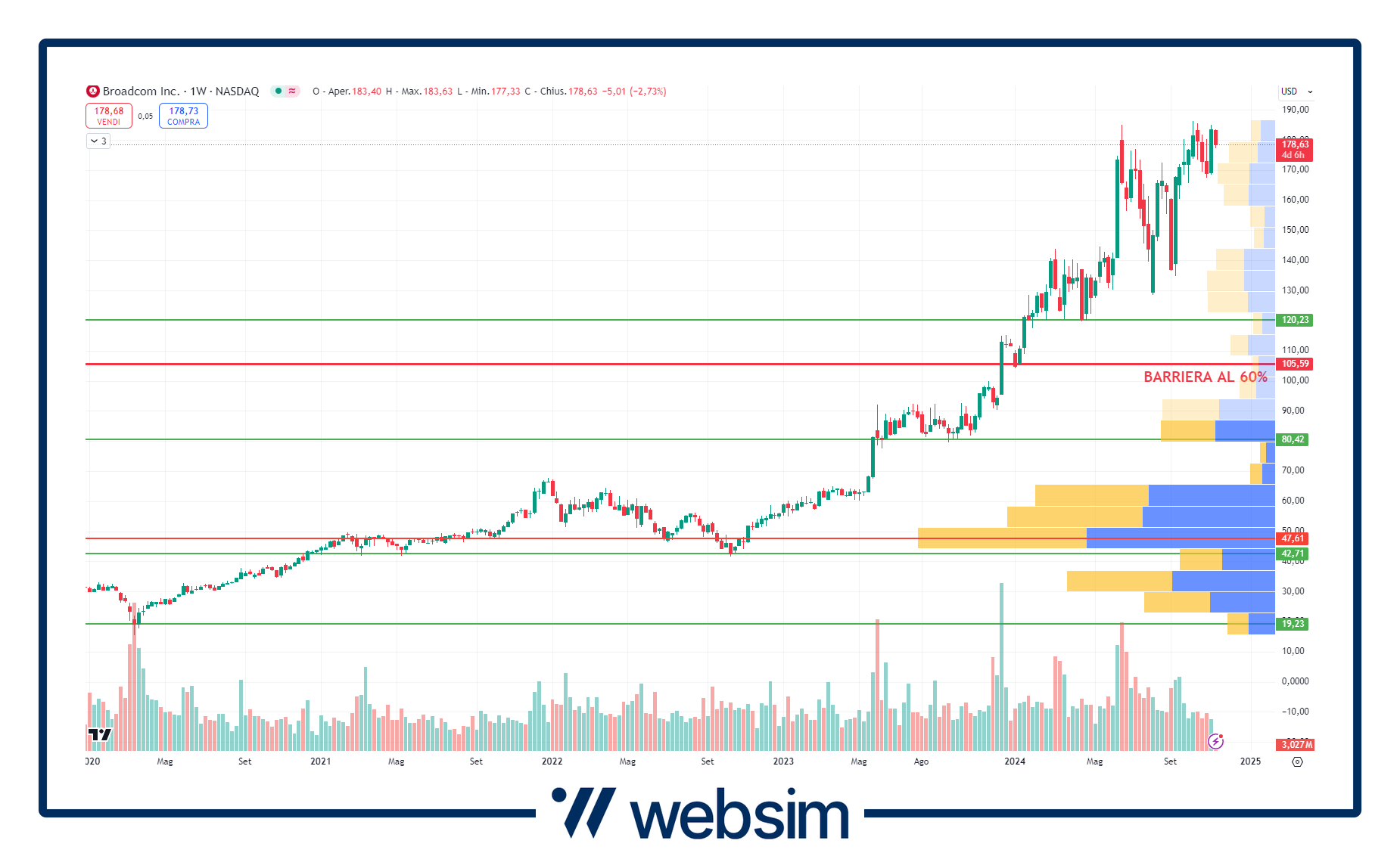 Nel grafico qui sotto possiamo vedere l'andamento su time frame settimanale di Broadcom. Come vediamo la barriera di protezione sul titolo è situata a 105,58 dollari, un prezzo molto distante dai prezzi attuali e al di sotto dell'importante area supportiva dei 120 dollari.