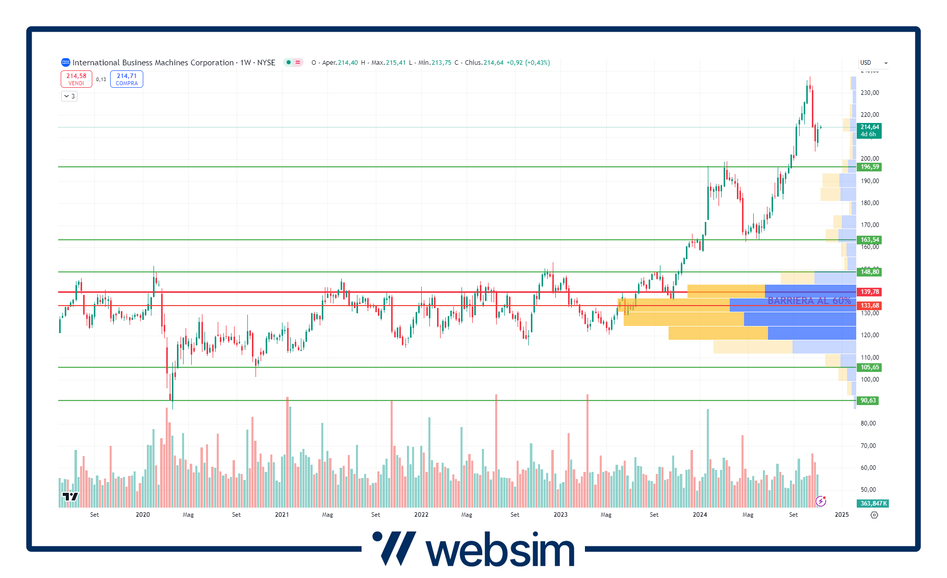 Recentemente Bank of America ha alzato il suo target price su IBM da 209 a 250 dollari con raccomandazione Buy. La media dei target price dei 20 analisti che coprono il titolo è 214 dollari, in linea con la quotazione attuale. Il P/E sull’utile stimato per il 2025 è di 24 volte, leggermente più alto della media di Wall Street. Dall’inizio dell’anno le azioni IBM sono salite del 32%. Su IBM la barriera al 60% si trova a quota poco sotto a 140 dollari. Sul titolo le principali aree di supporto si trovano a 196$, 163$ e 148$.