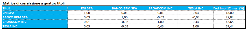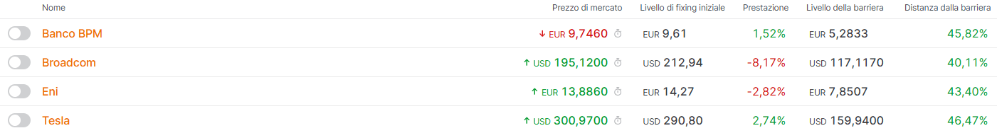 I quattro titoli del basket sono tra loro decorrelati e questo sicuramente aumenta il rischio del prodotto, che per l’appunto riesce a pagare un premio mensile monstre del 1,5%. Due titoli sono italiani quali Eni e Banco BPM e due Americani, Broadcom e Tesla.