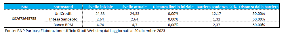 Comprando il certificate si investe sulle azioni delle prime tre banche italiane, Intesa Sanpaolo, Unicredit e BancoBPM. Tutte e tre si avviano a chiudere il 2023 con il record degli utili e per tutte e tre ci sono prospettive di ottima tenuta in futuro degli attuali livelli di redditività. Perché l’investimento in questo certificate si chiuda con un insuccesso dovrebbe accadere che anche solo una delle tre azioni sottostanti fra tre anni sia sotto la barriera al 50%, cioè abbia un valore più che dimezzato rispetto alla quotazione di oggi. E’ possibile? Certamente sì. E’ probabile? Secondo il consensus degli analisti no.