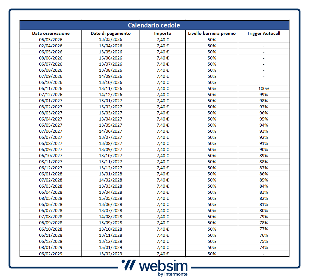 Per rendere più probabile il rimborso anticipato nei mesi successivi, il trigger dell'Autocall è decrescente: parte dal 100% degli strike a novembre 2026 e poi si riduce progressivamente dell'1% mensile fino al 74%.