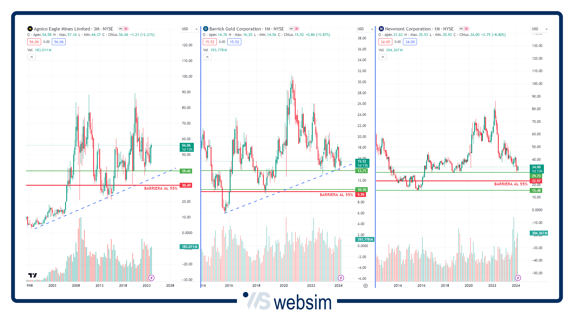 Dai grafici qui sotto (tre titoli su time frame mensile) possiamo vedere come le barriere al 55% si trovano al di sotto di importanti aree supportive su tutti e tre i titoli. In tal senso, su Agnico Eagle la principale area di supporto per i prezzi si trova a quota 40 dollari. Su Barrick prima a 13,7 dollari e poi verso l'area dei 10$, mentre per quanto riguarda Newmont la principale area di supporto è in area 30$.