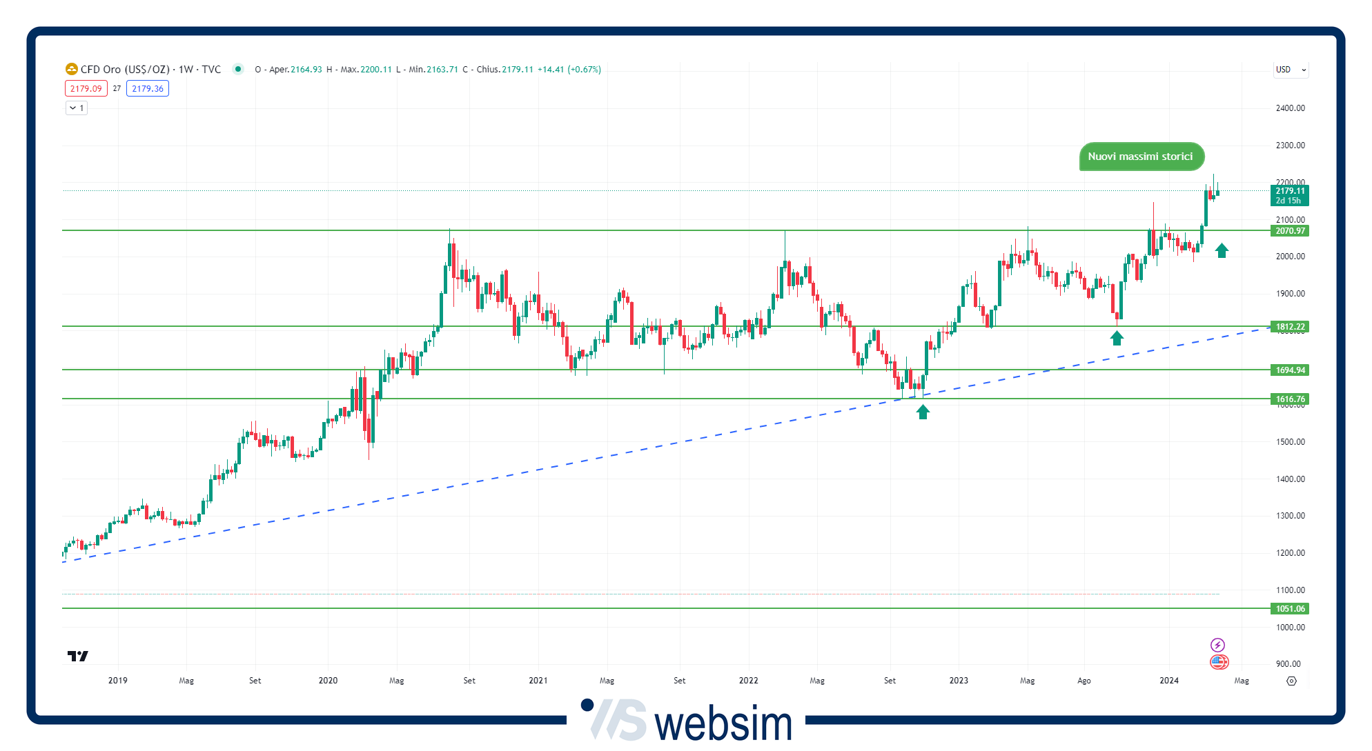 Analizzando la situazione grafica emerge chiaramente il trend positivo dell’oro. In passato le quotazioni avevano superato tre volte la soglia dei 2.000 dollari (in questi ultimi anni, fra il 2020 ed il 2023). Si era però trattato di fiammate brevi, con l’oro che nel giro di pochi giorni era tornato sotto su valori più bassi. Insomma, l’oro sopra i 2.000 dollari per oncia ci arrivava per questioni geopolitiche di breve termine o comunque spingeva molti trader a prendere profitto. L'andamento dell'oro è ben apprezzabile dal grafico su time frame settimanale (dal 2019 ad oggi) qui sotto. Al ribasso, in caso di prese di beneficio, sul bene rifugio per eccellenza sarà da monitorare la tenuta della principale area supportiva a quota 2070 dollari l'oncia e poi verso la soglia psicologica dei 2.000 $/o.