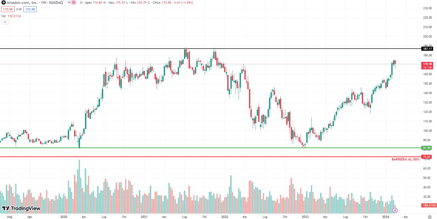Le azioni di Amazon navigano abbondantemente sopra il prezzo di osservazione iniziale. Dai 145,24 dollari iniziali sono balzate a 173. La barriera si è contestualmente allontanata ed è ora intorno al 40% dei prezzi di mercato (si è quindi protetti fino a -60% circa!). Il titolo appare all’interno di un solido trend bullish che ha portato la capitalizzazione di mercato a circa 1.800 miliardi di dollari.